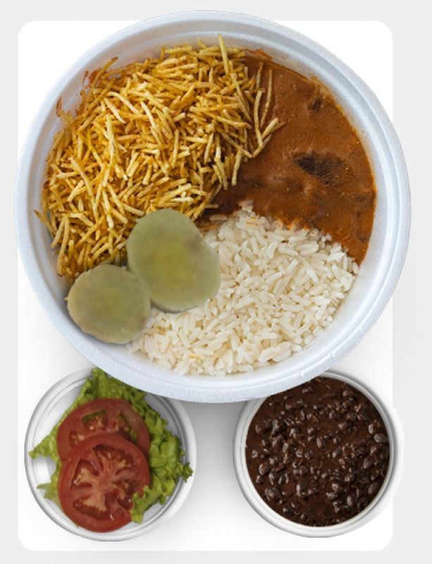 Acompanhada de arroz, feijão, batata doce, batata palha e salada.